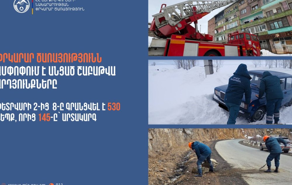 Փետրվարի 2-8-ը ՆԳՆ ՓԾ ճգնաժամային կառավարման ազգային կենտրոնում գրանցվել է 530 դեպք, որից 145-ը՝ արտակարգ: Այս մասին տեղեկացնում են ՆԳՆ Փրկարար ծառայությունից: