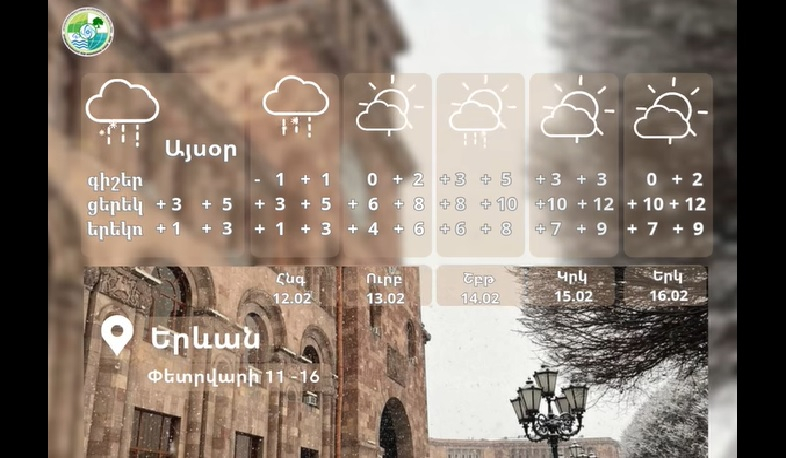 Երևանում փետրվարի 11-ի ցերեկը, 12-ին ժամանակ առ ժամանակ սպասվում են տեղումներ ձյան և ձնախառն անձրևի տեսքով, 14-ի ցերեկը սպասվում է անձրև։ Փետրվարի 13-ին և 15-16-ը սպասվում է առանց տեղումների եղանակ։ Փետրվարի 12-15-ի գիշերը և առավոտյան ժամերին սպասվում է նաև մառախուղ։