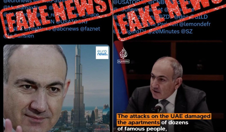 Նախորդող օրերի ընթացքում X հարթակում կասկածելի օգտատերերի կողմից տարածվում են տեսանյութեր, որոնք իբրև թե հղում են անում Al Jazeera-ին և Euronews-ին՝ պնդելով, թե ԱՄԷ-ում՝ Դուբայում հրթիռակոծության հետևանքով վնասվել է ՀՀ վարչապետ Նիկոլ Փաշինյանին պատկանող անշարժ գույքը։