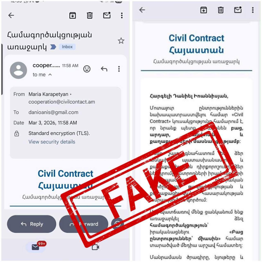 «Քաղաքացիական պայմանագիր» կուսակցության վարչության փոխնախագահ Վահագն Ալեքսանյանը տեղեկացնում է քաղաքացիներին, մեդիայի և ՀԿ ներկայացուցիչներին, որ վերջին օրերին դեռևս անհայտ խաբեբաներ «Քաղաքացիական պայմանագիր» կուսակցության դոմեյնին շատ նման civilcontact.am (իրականը՝ civilcontRact.am) դոմեյնով էլ.փոստ են բացել ու Կուսակցության և պատգամավոր Մարիա Կարապետյանի անունից նամակներ են ուղարկում տարբեր անձանց։