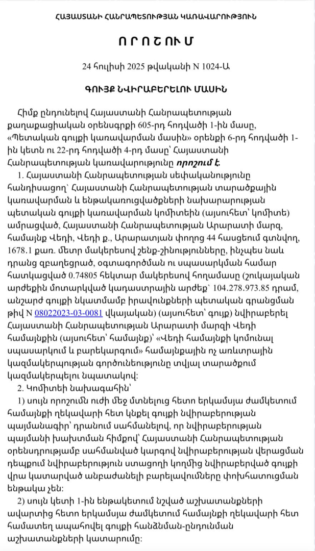 Համայնքի ղեկավարը գրառմանը կից հրապարակել է նաև Կառավարության համապատասխան որոշման լուսանկարը՝ որպես հիմնավորում։