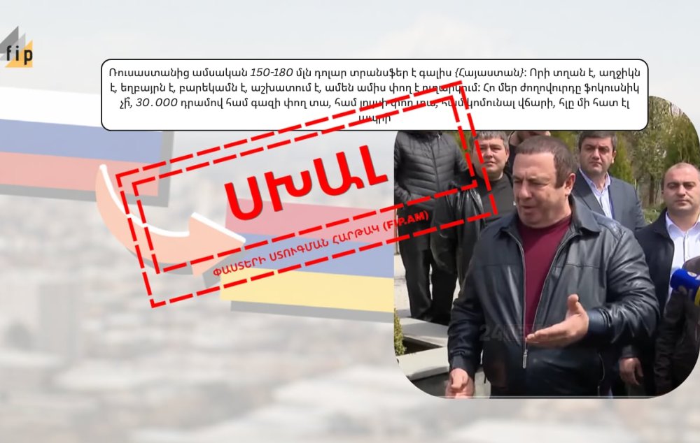 Fip-ը գրում է․ Կոտայքի մարզ այցի ընթացքում քաղաքացիների հետ հանդիպման ժամանակ «Բարգավաճ Հայաստան» կուսակցության նախագահ Գագիկ Ծառուկյանն ասել է․ «Ռուսաստանից ամսական 150-180 մլն դոլար տրանսֆեր է գալիս {Հայաստան}։ Որի տղան է, աղջիկն է, եղբայրն է, բարեկամն է, աշխատում է, ամեն ամիս փող է ուղարկում։ Հո մեր ժողովուրդը ֆոկուսնիկ չի՞, 30․000 դրամով համ գազի փող տա, համ լույսի փող տա, համ կոմունալ վճարի, հլը մի հատ էլ ապրի»։