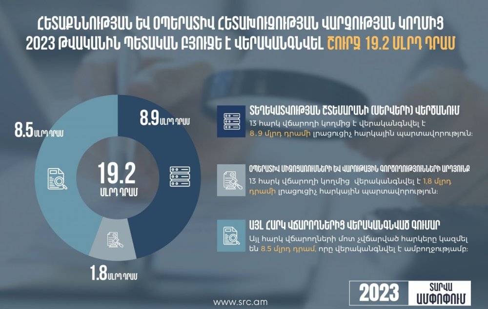 Հետաքննության և օպերատիվ հետախուզության վարչության կողմից ձեռնարկված օպերատիվ-հետախուզական միջոցառումների շրջանակում, ծածկագրված եղանակով իրականացված հսկիչ գնումների, պետությանը պատճառված վնասի նախնական հաշվարկների, հարկային մարմնին ներկայացված հաշվարկներում խեղաթյուրված տվյալներ մտցնելու արդյունքում անմիջականորեն ծագած հիմնավոր կասկածի առկայության հիմքերով իրականացված ձերբակալումների, դրան ուղեկցող անձնական խուզարկությունների, ինչպես նաև միջոցառումների ընթացքում անհետաձգելի վարութային գործողությունների արդյունքում 13 հարկ վճարողի կողմից վերականգնվել է շուրջ 1.8 մլրդ դրամի լրացուցիչ հարկային պարտավորություն: Ցանկն՝