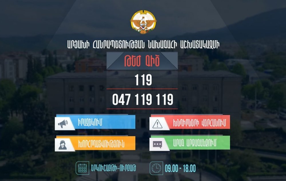 Արցախի Հանրապետության նախագահի աշխատակազմը գործարկել է արագ արձագանքման թեժ գիծ՝ 119 կարճ հեռախոսահամարով՝ քաղաքացիների ու Արցախի այցելուների հետ հաղորդակցությունն առավել արդյունավետ դարձնելու, նրանց հարցերին, առաջարկություններին, պահանջներին ու բողոքներին առավել գործուն կերպով արձագանքելու նպատակով, հայտնում են ՀՀ նախագահի աշխատակազմի տեղեկատվության գլխավոր վարչությունից: