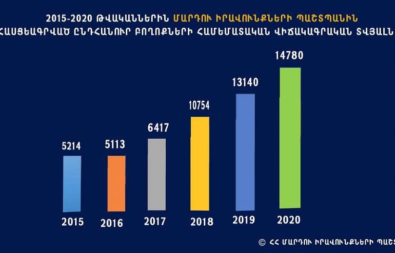 2020 թվականին զգալիորեն աճել է Մարդու իրավունքների պաշտպանի հաստատության ծանրաբեռնվածությունը: ՄԻՊ-ին հասցեագրված դիմում-բողոքների և սեփական նախաձեռնությամբ վարույթների թիվը կազմել է 14.780: Այս մասին տեղեկացնում է ՀՀ ՄԻՊ-ը: