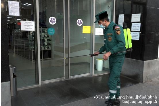 Կորոնավիրուսի համավարակով պայմանավորված՝ ԱԻՆ Փրկարար ծառայության տնօրենի հրամանով հանրապետության հրշեջ-փրկարարական ջոկատները շարունակում են վարակազերծման աշխատանքներ իրականացնել Երևանի և մարզերի հանրային վայրերում՝ կանգառներում, խոշոր առևտրի կենտրոններում, բանկերում և վարկային կազմակերպություններում:
