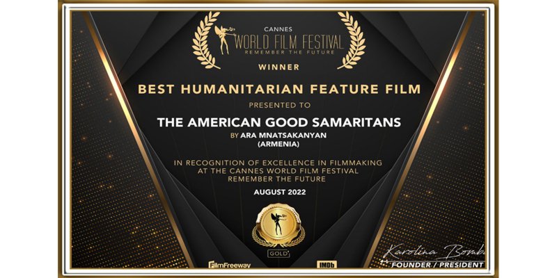 «Ամերիկացի բարի սամարացիները» ֆիլմը (ռեժիսոր՝ Արա Մնացականյան, արտադրությունը՝ «Ման Փիքչերս Փրոդաքշեն» ընկերություն) Կաննի համաշխարհային կինոփառատոնում «Լավագույն մարդասիրական ֆիլմ»անվանակարգում հաղթող է ճանաչվել՝ արժանանալով մրցանակի, տեղեկացնում են ԿԳՄՍՆ-ից։ Ֆիլմը նվիրված է ազգերի փրկության նվիրյալների հիշատակին՝ մարդկանց, որոնք իսպառ ոչնչացումից փրկել են քրիստոնյա ժողովուրդների զավակներին։ Ֆիլմի ռեժիսոր՝ Արա Մնացականյան, սցենարիստ՝ Ամբեր Կարլինս (ԱՄՆ), պրոդյուսեր` Մանվել Սարիբեկյան, օպերատոր՝ Աշոտ Մկրտչյան, արտադրող՝ «Ման Փիքչերս Փրոդաքշեն» ընկերություն: Նշենք, որ ՀՀ ԿԳՄՍՆ ենթակայությամբ գործող Հայաստանի ազգային կինոկենտրոնի կողմից ֆիլմը ստացել է մասնակի աջակցություն: