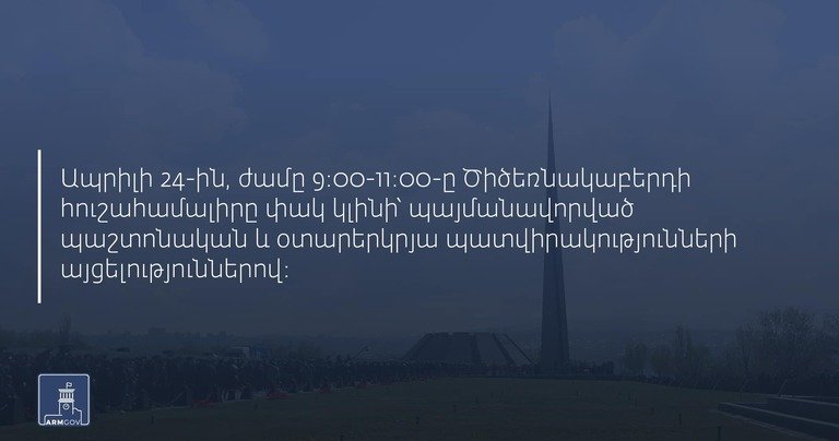 ՀՀ պետական միջոցառումների նախապատրաստման և կազմակերպման հանձնաժողովից տեղեկացնում են, ապրիլի 24-ին, ժամը 9։00-11։00-ն ընկած ժամանակահատվածում Ծիծեռնակաբերդի հուշահամալիրը փակ կլինի՝ պայմանավորված պաշտոնական և օտարերկրյա պատվիրակությունների այցելություններով։