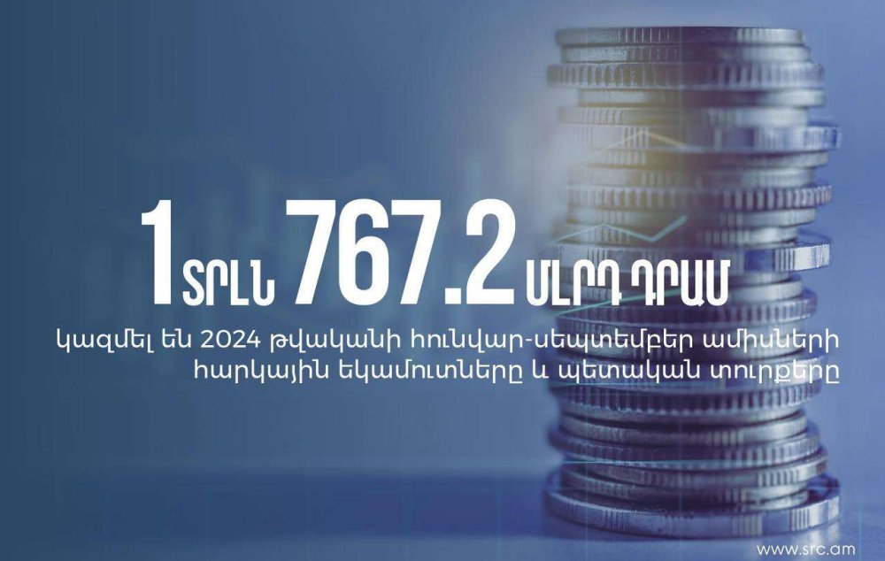 Պետական եկամուտների կոմիտեն տեղեկացնում է, որ 2024թ. հունվար-սեպտեմբեր ամիսների ընթացքում հարկային մարմնի կողմից հավաքագրվել են շուրջ 1 տրլն 698.6 մլրդ դրամ եկամուտներ, ինչը նախորդ տարվա նույն ժամանակաշրջանի ցուցանիշից ավելի է շուրջ 189.1 մլրդ դրամով կամ 12.5%-ով: Մաքսային մարմնի կողմից հավաքագրվել է շուրջ 312 մլրդ դրամ եկամուտ, ինչը նախորդ տարվա նույն ժամանակաշրջանի ցուցանիշից պակաս է շուրջ 60.8 մլրդ դրամով կամ 16.3%-ով: