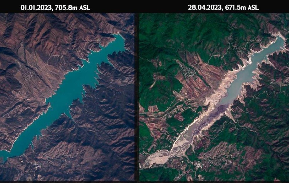 Կից՝ Սարսանգի ջրամբարի արբանյակային լուսանկարները՝ 2023թ. հունվարի 1-ի և ապրիլի 28-ի դրությամբ՝ ծովի մակարդակից համապատասխանաբար 705.8 և 671.5 մետր բարձրությամբ մակերևույթով: