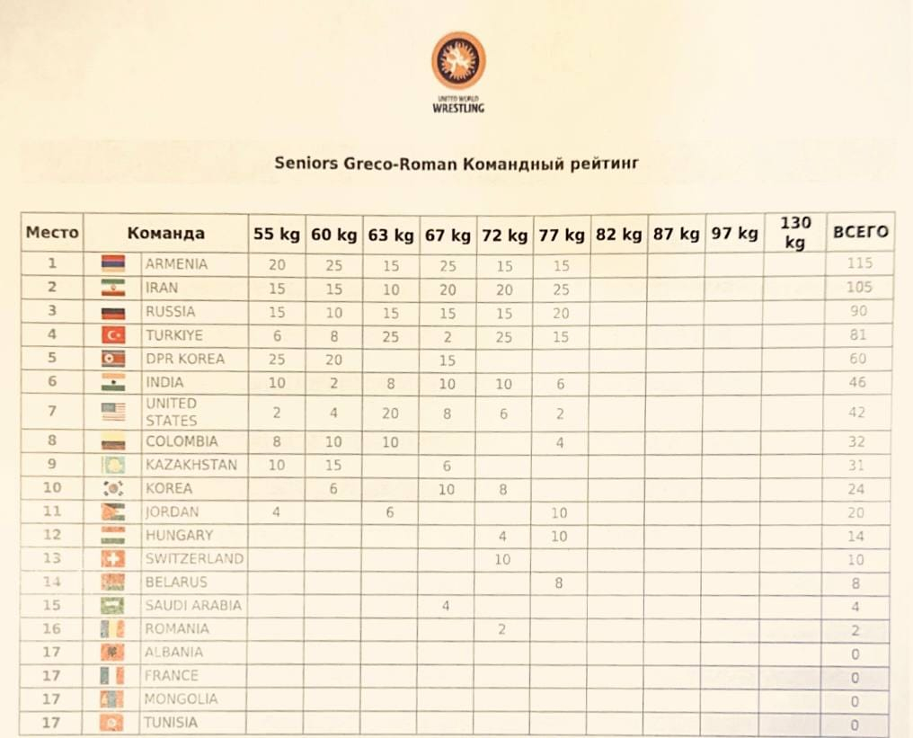 Այս պահի դրությամբ Ըմբշամարտի զինվորականների աշխարհի առաջնության թիմային աղյուսակում ՀՀ ԶՈՒ հավաքականը հունահռոմեական ոճում զբաղեցնում է 1-ին հորիզոնականը, ազատ ոճում՝ 4-րդը: