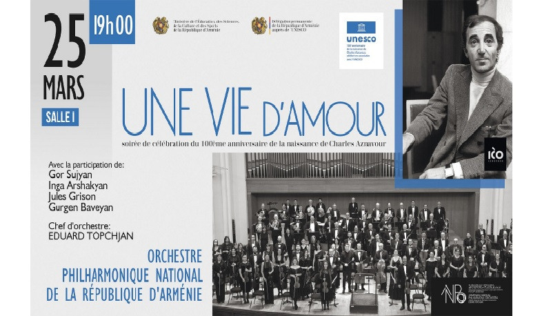 ԿԳՄՍ նախարարությունից հայտնում են՝ մարտի 25-ին Փարիզում՝ ՅՈՒՆԵՍԿՕ-ի կենտրոնակայանում, տեղի կունենա գալա-համերգ՝ նվիրված շանսոնի և երաժշտարվեստի համաշխարհային լեգենդ, ՅՈՒՆԵՍԿՕ-ում Հայաստանի Հանրապետության դեսպան Շառլ Ազնավուրի ծննդյան 100-ամյա հոբելյանին: Համերգը կրում «Une vie d'amour» («Սիրով լի կյանք») խորագիրը: