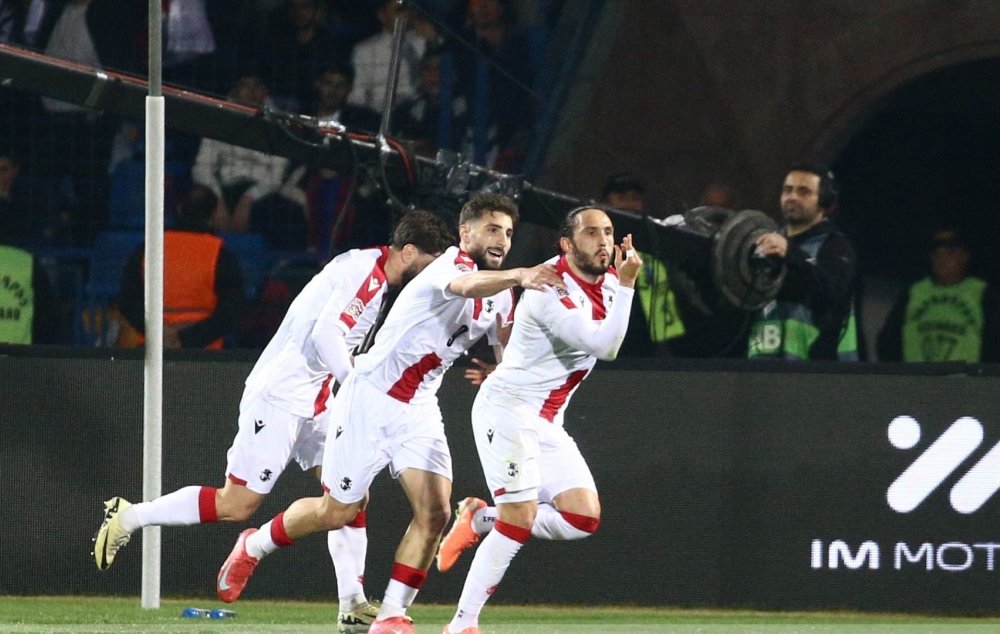 32-րդ րոպեին «Նոայի» կիսապաշտպան Արտակ Դաշյանի սխալից հետո վրացիները հակագրոհեցին, հաշիվը բացեց իսպանական «Լևանտեի» կիսապաշտպան Գեորգի Կոչորաշվիլին: Ընդամենը 5 րոպե անց ֆրանսիական «Լիոնի» հարձակվող Ժորժ Միկաուտաձեն խորքից փոխանցում ստացավ և գրավեց Օգնյեն Չանչարևիչի դարպասի մոտակա անկյունը: