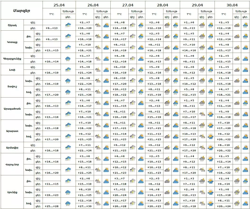 Հայաստանի Հանրապետության տարածքում ապրիլի 26-ի երեկոյան, 27-ի գիշերը շրջանների զգալի մասում սպասվում է անձրև և ամպրոպ, առանձին հատվածներում հորդառատ։ Ապրիլի 27-ի ցերեկը, 28-30-ին առանձին շրջաններում սպասվում է կարճատև անձրև և ամպրոպ։ Տեղեկությունը հայտնում է Հիդրոօդերևութաբանության և մոնիտորինգի կենտրոնը։