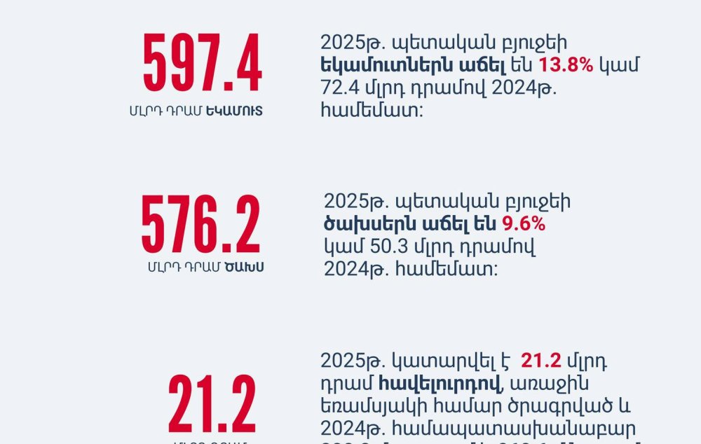 2025 թվականի հունվար-մարտ ամիսների ընթացքում ՀՀ պետական բյուջեն կատարվել է 21.2 մլրդ դրամ հավելուրդով՝ առաջին եռամսյակի համար ծրագրված և նախորդ տարվա նույն ժամանակահատվածի համապատասխանաբար 233.3 մլրդ դրամ և 868.6 մլն դրամ պակասուրդի դիմաց: