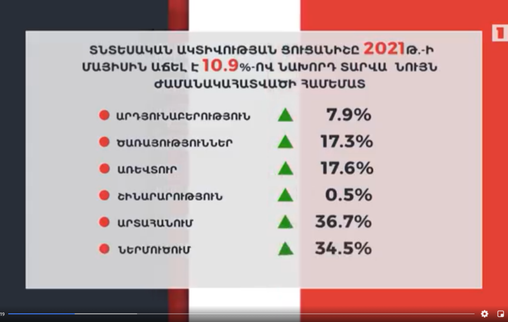 Հայաստանի տնտեսությունը վերականգնման փուլում է. տնտեսական ակտիվության ցուցանիշը 2021թ. հինգ ամսում աճել է 4.3 տոկոսով` նախորդ տարվա համեմատ։