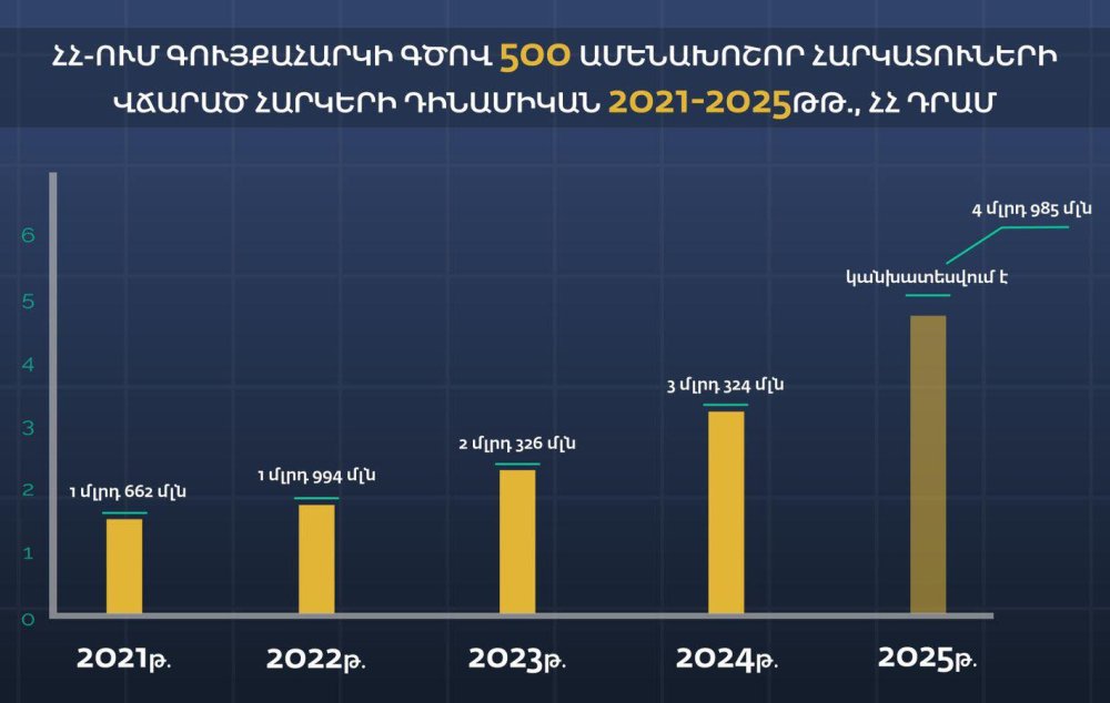 Հայաստանում գույքահարկի գծով 500 ամենախոշոր հարկատուները 2024-ին վճարել են 3 մլրդ 324 մլն դրամ՝ 2021-ի 1 մլրդ 662 մլն դրամի դիմաց։ Այդ ցուցանիշը, համաձայն կանխատեսումների, 2025-ին կկազմի 4 մլրդ 985 մլն դրամ։ Այս մասին են վկայում ՀՀ կադաստրի կոմիտեի տվյալները։