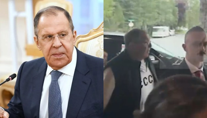 ժիլետի տակից երևում էր СССР գրությունը։ Լավրովի՝ Անքորիջի հյուրանոց մուտք գործելու